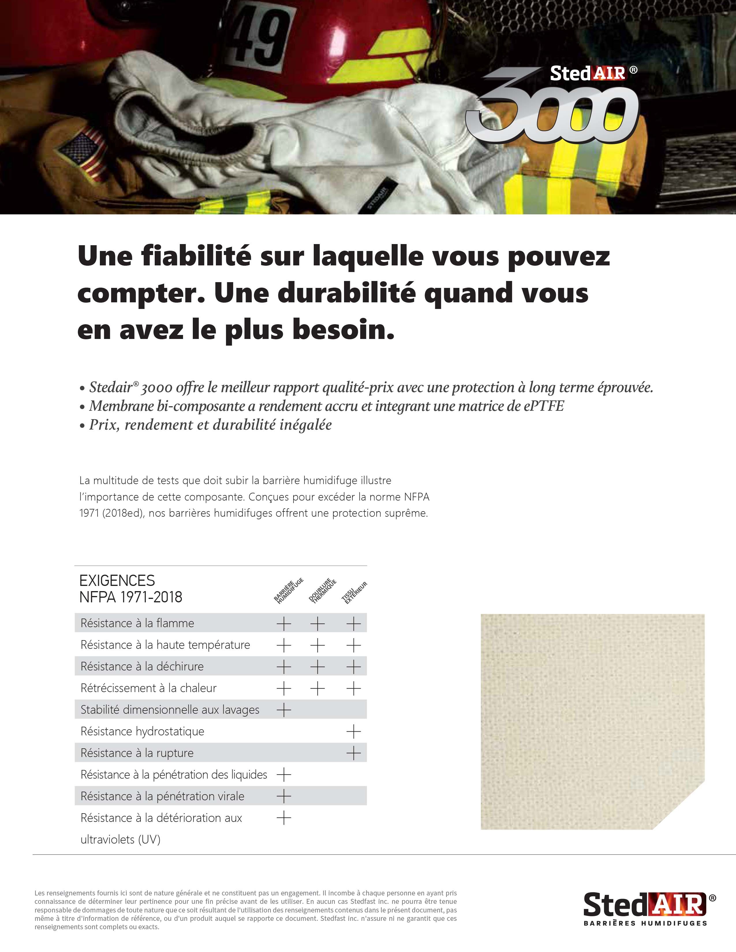 Stedair® 3000 : En alliant deux technologies, les membranes microporeuses et les membranes monolithiques, Stedair® 3000 respecte, voire excède l'ensemble des exigences de la norme NFPA 1971 (édition 2018) et fournit des indices exceptionnels de perte de chaleur totale (THL) et de protection thermique (TPP).