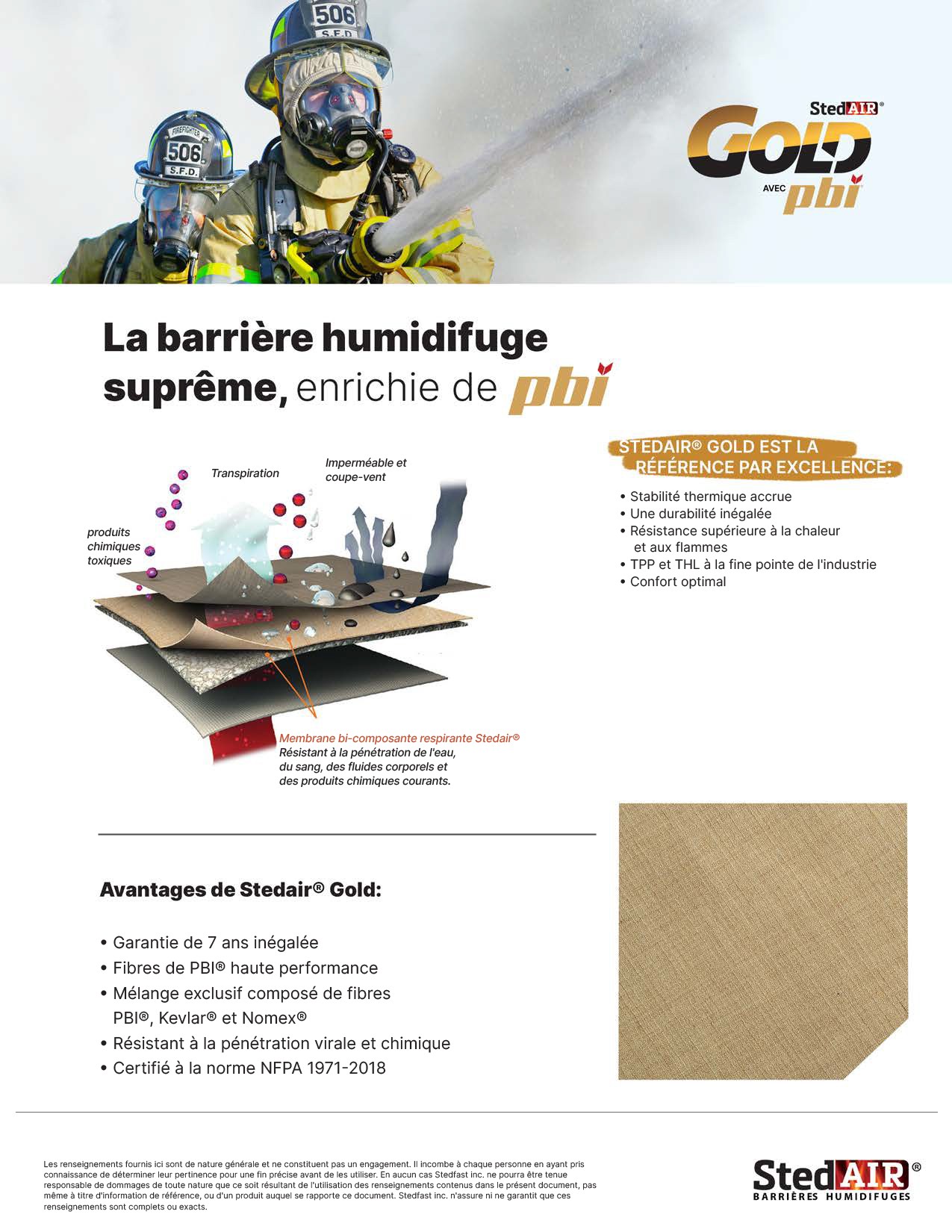 Substrat exclusif composé de PBI® (20%) Kevlar® (30%) Nomex® (50%) laminé avec une membrane ePTFE respirante. Cette barrière humidifuge imper-respirante est formée d'une armure toile de Nomex de 2.8 onces/vg2 laminée à une membrane bi-composant à rendement accru intégrant une matrice de PTFE expansé (TeflonMD) revêtue d'un polymère hautement ingénierie, procurant ainsi une durabilité exceptionnelle. STEDAIR® GOLD, chef de file de l'industrie, assure avec constance un indice de protection thermique et une perte de chaleur totale marquée. Stedfast s'engage avec conviction auprès des services des incendies de l'Amérique du Nord.
